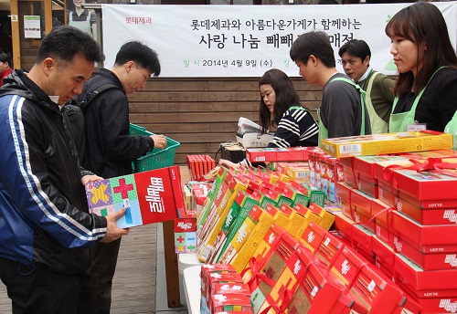 롯데제과(대표 김용수)는 지난 4월 초 빼빼로, 가나 등 제품 총 5천여 박스 소비자가 기준 약 4억 원 상당의 제품을 ‘아름다운 가게’에 전달했다고 10일 밝혔다.