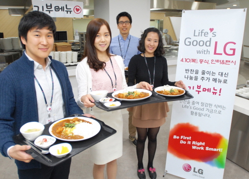 이날 LG전자 임직원들은 점심시간에 점심식사로 카레라이스와 꼬치어묵 등을 기부 식단으로 선택했다. 기부 식단은 기존 가격으로 받되, 반찬을 줄여 원가를 낮추고 차액은 기부금으로 자동 적립된다.