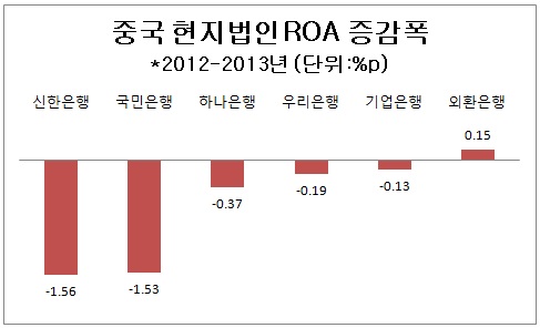 11일 소비자가 만드는 신문이 기업, 외환, 우리, 하나, 신한, 국민 등 국내 6개 은행의 중국 현지법인의 재무상황을 조사한 결과 지난해 말 기준으로 전체 자산규모는 16조8천476억 원이었고 순이익 106억3천만 원으로 자산수익률(ROA)가 0.06%를 기록했다. 이는 2012년 0.58%보다 0.52%포인트 하락한 수치다.