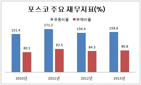 부채비율도 포스코 단독으로 보면 26%로 상당히 우량한 편이지만, 그룹 전체로 보면 80%가 넘는다. 이마저도 2010년 말에는 80.1%에서 지난해 말 86.8%로 3년간 6.7%포인트 상승했다. 같은 기간동안 유동비율은 151.4%에서 159.6%로 8.2%포인트 올랐다.