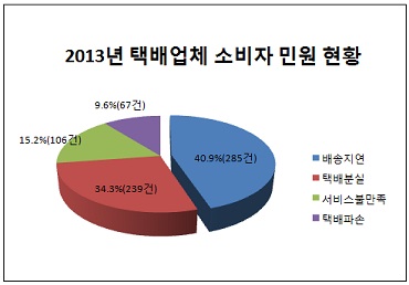 민원은 배송지연에 대한 불만이 가장 높아서 40.9%(285건)에 달했고 이어 택배 분실(34.3%, 239건), 서비스 불만족(15.2%, 106건), 택배 파손(9.6%, 67건) 순으로 나타났다.