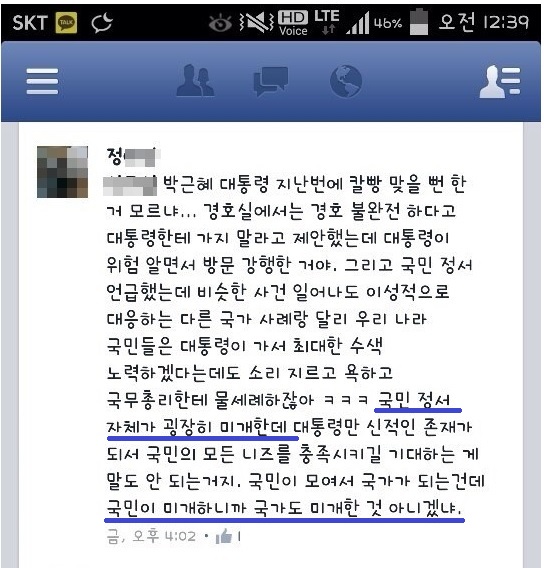 정 씨는 지난 18일 오후 4시 자신의 페이스북에 실종자 가족을 두고 "대통령에 소리 지르고 욕하고 국무총리에 물세례ㅋㅋㅋ 국민 정서 자체가 굉장히 미개"하다는 글을 올렸다.