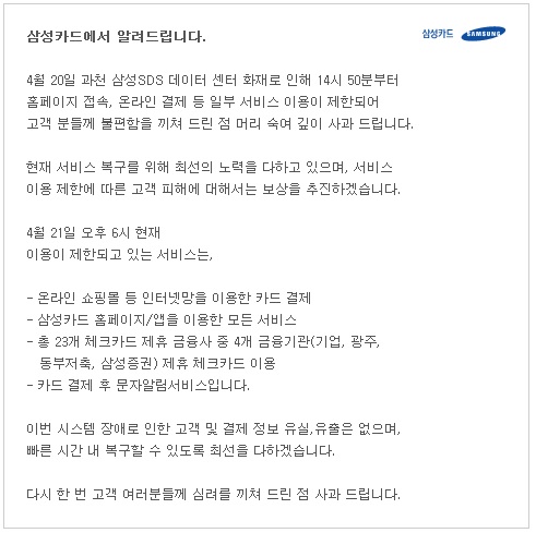 삼성카드 일부 결제 서비스가 장시간 마비된 것은 인터넷 결제 서버를 화재가 발생한 삼성SDS 과천센터 한 곳에만 둬서 방대한 데이터 양 때문에 복구할 때까지 적지 않은 시간이 소요되기 때문이다.