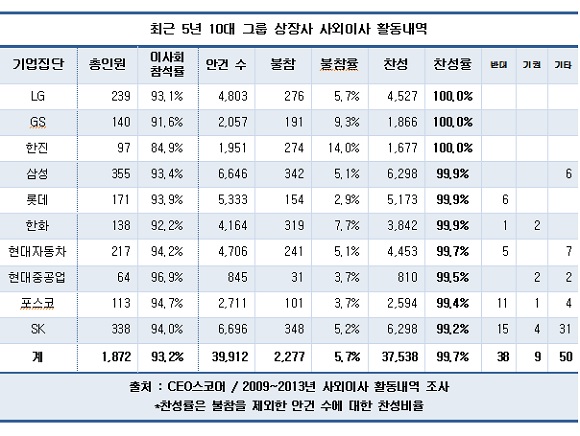 23일 기업경영성과 평가사이트인 CEO스코어(대표 박주근)가 지난 2009~2013년 5년 동안 10대 그룹 92개 상장 계열사의 사외이사 활동내역을 조사한 결과 총 1천872명의 사외이사들이 4천626건의 이사회에 참석해 3만7천635표의 의결권을 행사했고 이중 찬성표는 99.7%인 3만7천538표였다.