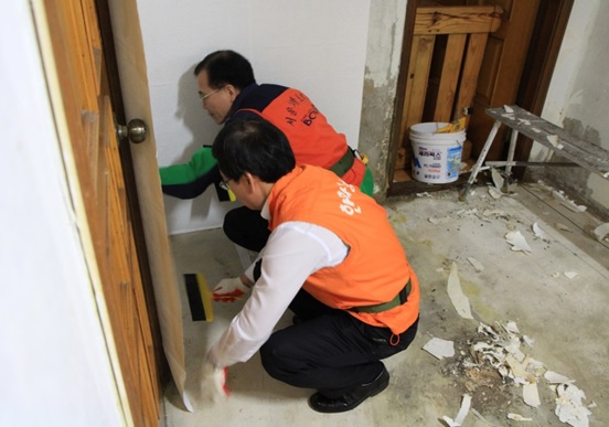 보훈가죽 주거환경개선사업인 ‘2014 나라사랑 클린하우스’ 1호 사업에 참여해 도배 작업을 돕고 있다.(출처=㈜한화)