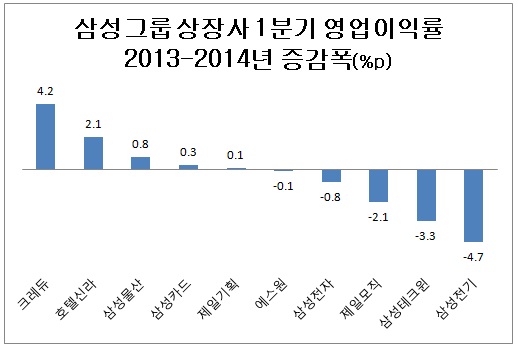 이와 달리 삼성테크윈, 삼성전기, 제일모직, 삼성전자등 4개사도 작년 동기 대비 영업이익이 감소했다.