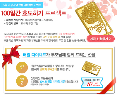 100일간 효도하기 프로젝트에 참여하는 모든 참가자에게는 10%의 할인 혜택이 주어지고 참여 고객 중 3명을 추첨해 카네이션 골드바를 선물로 증정한다.