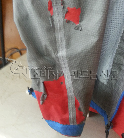 이제껏 아웃도어를 몇 벌이나 입었지만 내피 코팅 부분이 이렇게 떨어지는 경우는 처음이라는 안 씨.
