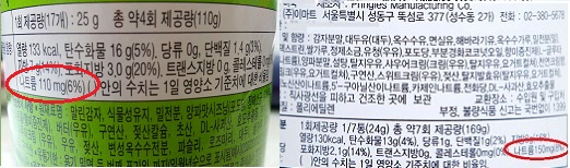 이마트 직수입 ‘사워크림&어니언’은 24g에 나트륨 함량이 150mg이고 농심켈로그는 25g에 나트륨이 110mg에 불과했다. 역시 이마트 직수입 프링글스가 42%나 나트륨이 더 많다.
