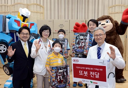 기아자동차(대표 이형근)는 지난 26일 국립암센터에 혈액암 환아 및 환자 자녀 100명을 초청해 K3, 레이, 쏘렌토 등 기아차 주요 모델을 활용해 제작한 인기 캐릭터 '또봇' 완구를 증정하는 행사를 진행했다고 밝혔다.