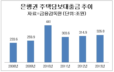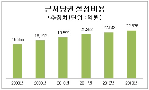 한편 17개 국내 은행의 주택담보대출금은 2008년 233조6천억 원에서 지난해 326조8천억 원으로 늘어나는 추세다. 가계대출이 67~68% 정도로 비중이 크며 근저당권 설정비용도 1조 원대에서 2조 원대로 불어났다.