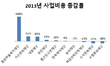 전년도에 비해 사업비를 가장 많이 늘린 곳은 중외복지재단으로 2012년 1억5천500만 원에서 지난해 원으로 8억8천만 원으로 468%를 늘렸다. 가산문화재단도 전년도에 비해 사업비가 91%나 증가했다.