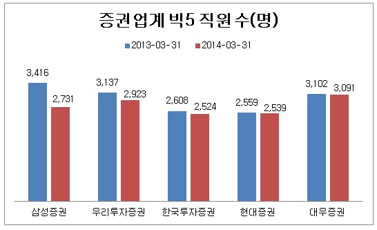 2일 금융감독원 공시자료에 따르면 대우증권과 삼성증권, 우리투자증권, 현대증권, 한국투자증권 등 5대 증권사의 총 직원수는 지난해 3월 말 1만4천822명에서 올해 3월 말 1만3천808명으로 6.8% 감소했다. 5개 증권사에서만 1년새 1천 명이 넘는 인원을 줄인 것이다.