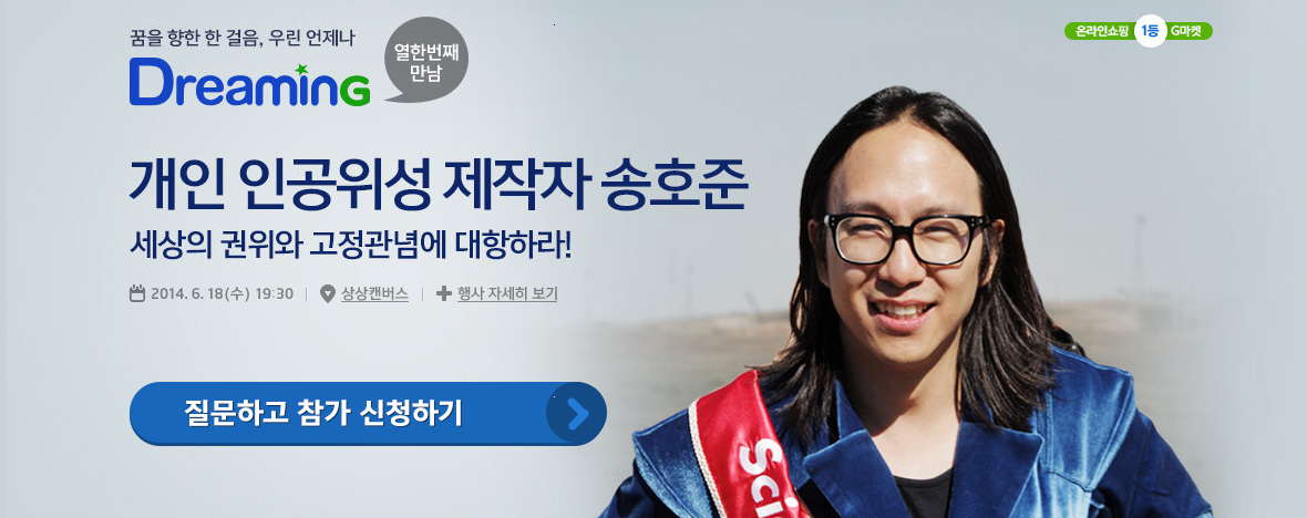 이번 행사는 세계 최초로 개인 인공위성 발사 프로젝트를 성공시킨 미디어 아티스트 송호준 씨와 함께 ‘세상의 권위와 고정관념에 대항하라!’는 주제로 개최될 예정이다. 오는 10일까지 G마켓 이벤트 페이지(http://gmkt.kr/tHr0-qzo)에서 ‘참가신청’ 버튼을 클릭한 후 강연자 송호준 씨에게 묻고 싶은 질문을 남기면 신청 가능하다.