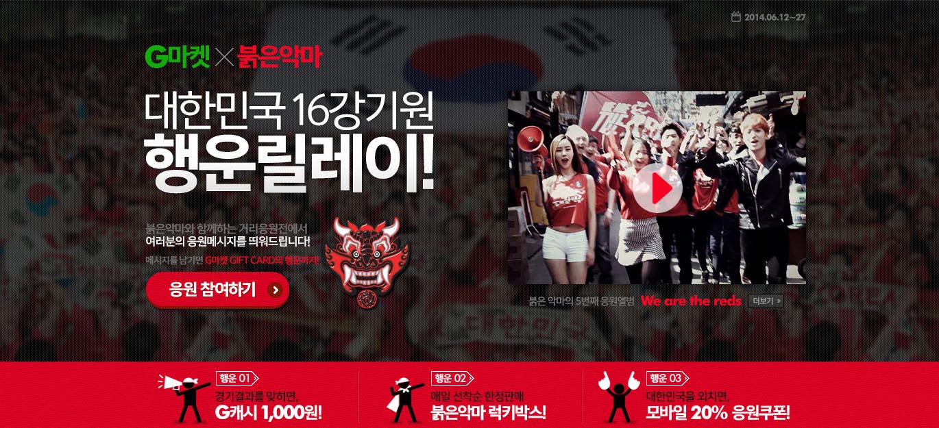 G마켓 마케팅실 강선화 실장은 “태극전사들의 선전을 기원하는 동시에 대회 기간 동안 고객들이 즐기며 응원할 수 있는 이벤트를 마련했다”며 “붉은악마 ‘G마켓 럭키박스’, 모바일 할인 혜택, 12개월 무이자 등 다양한 혜택이 주어지는 만큼 많은 고객들이 참여할 것으로 기대하고 있다”고 말했다.