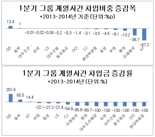 한편, KT를 비롯해 미래에셋, 롯데, 부영, 효성 등 12개 그룹은 지난해보다 계열사간 차입비중이 축소됐다.