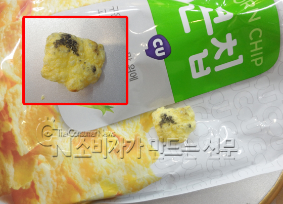CU에서 판매되고 있는 과자에서 곰팡이로 보이는 물질이 발견됐기 때문. 회사 측은 곰팡이가 아니라 탄화물이라고 주장했다.