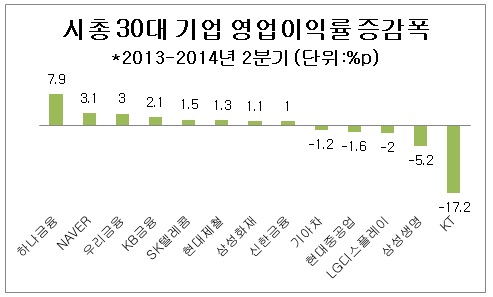 반면 삼성생명은 영업이익률이 5.8%에서 0.6%로 5.2%포인트나 하락했다. LG디스플레이와 현대중공업도 영업이익률이 각각 2%포인트, 1.6%포인트 낮아졌다.
