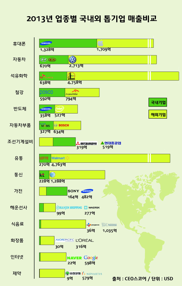 글로벌 순위는 지난해 매출액을 기준으로 했으며, 여러 업종에 걸쳐 사업을 영위하는 기업의 경우는 부문별 실적을 추출해 사용했다.