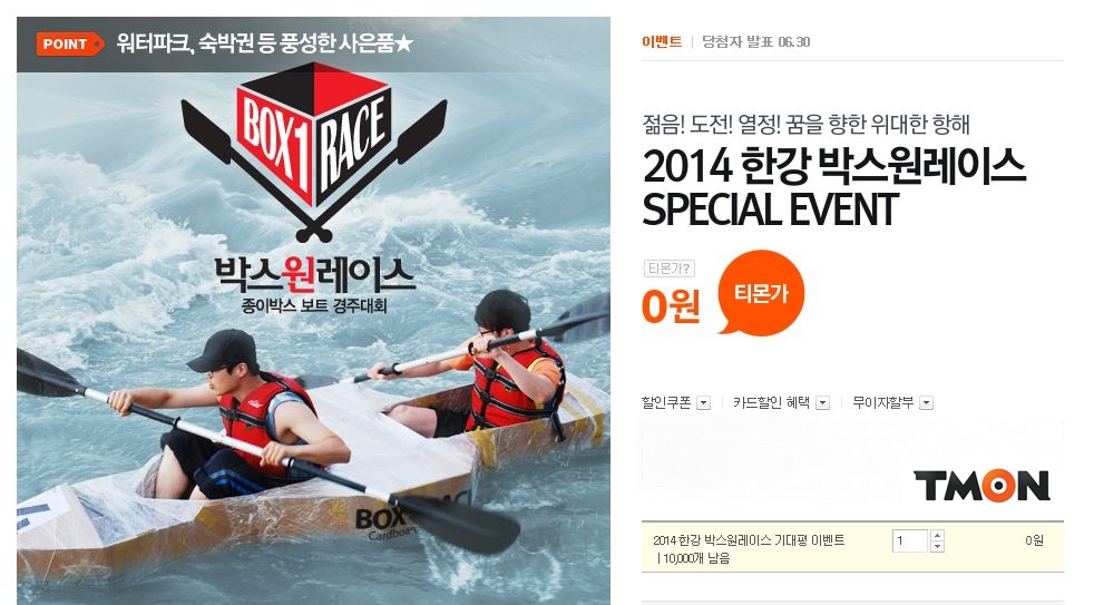티몬 이인복 멀티비즈그룹장은 “2014 한강 박스원레이스로 또 하나의 재미있는 이벤트를 고객들에게 선사할 수 있게 되어 매우 기쁘다”며 “지난해 싱글남녀 짝여행, 좀비런 등 행사를 성공적으로 치렀던 것처럼 건전하면서도 재미있는 여가문화 창조에 계속해 이바지해 나가겠다”고 밝혔다.