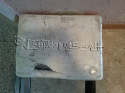 경비실에 내려가 물건을 확인한 이 씨는 더 분통이 터졌다. 하얀 아이스박스는 형체를 알아볼 수 없을 정도로 검은 때가 잔뜩 묻었고 밑부분은 깨져 구멍이 뚫린 데다 테이프로 칭칭 감아 놓은 상태였다.