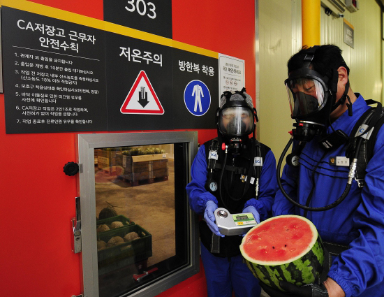 기존 대기조건인 질소 78%, 산소 21%, 기타 1%를 CA 저장고를 통해 산소 3~7% 전후, 이산화탄소 5~8% 전후, 질소 85~92%, 기타 1%로 대기조건을 조정했다. 산소비율을 극도로 낮춤으로써 농작물이 나이를 먹는 시간을 거의 ‘정지’에 가깝게 멈춘 것으로 수박의 생육속도를 조절, 수박의 노화를 억제했다는 설명이다.