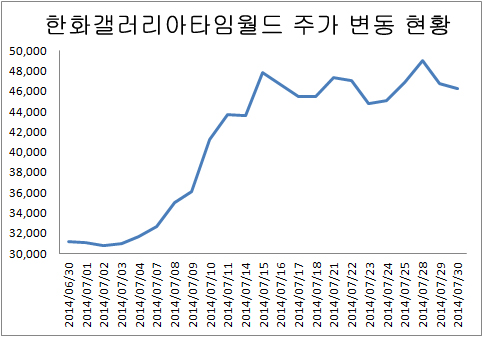 업계에 따르면 타임월드는 지난 7월30일 주가 4만6천300원으로 장을 마쳤다. 1달 전인 6월30일(3만1천200원)과 비교하면 48.3% 오른 수준이다.
