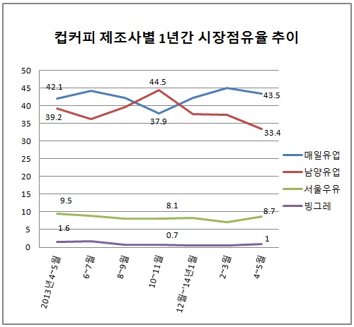시장조사기관 AC닐슨에 따르면 매일유업은 지난 4~5월 컵커피 시장점유율 43.5%를 기록하며 남양유업(33.4%)을 10.1%포인트 차로 앞질다.