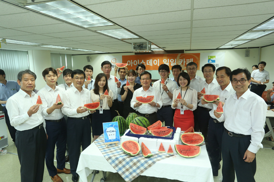 이날 서울 장교동 한화빌딩 10층에 마련된 수박데이 행사장을 찾은 이근포 사장은 임직원들과 함께 수박을 나누고 직원들을 격려하며 격의 없는 소통의 시간을 가졌다.