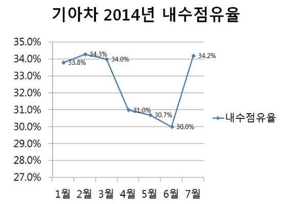 한 때 내수 30% 벽이 무너질 뻔했지만 카니발이 구원투수가 된 셈이다. 내수시장이 호조를 보이면서 내수 점유율도 최고치를 기록한 2월(34.3%) 수치에 근접할만큼 다시 안정되고 있다.