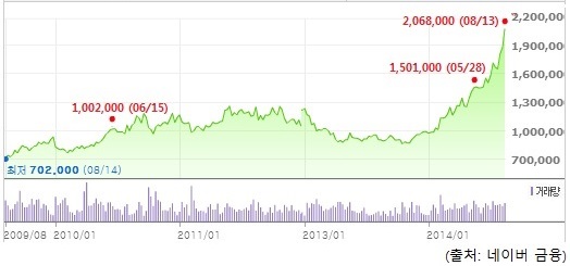 아모레퍼시픽 주가는 지난 2010년 6월 15일 100만2천 원으로 100만 원대에 도달 한 뒤 3년 만인 지난 5월 28일에야 150만 원 선을 넘어섰다. 그리고 채 3개월이 지나기도 전에 200만 원 고지를 돌파한 것이다.