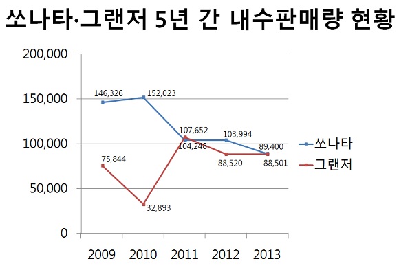 2009년만 해도 그랜저 내수 판매량은 7만5천844대로 쏘나타 14만6천326대에 비해 절반을 겨우 웃도는 수준이었다. 그러나 2011년에 그랜저 판매량이 10만대를 넘기면서 쏘나타를 일시적으로 추월했고 지난해에는 쏘나타와 불과 900여 대의 차이를 보였다.