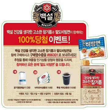 오는 31일까지 전국 주요 매장에서 백설 건강을 생각한 고소한 참기름과 팔도 비빔면 동시 구매 영수증을 휴대폰으로 인증샷 촬영 후 #66301로 보내면 팔도 비빔면을 무료로 받을 수 있다.