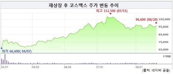 코스맥스는 재상장한 4월 7일(종가 기준) 6만7천200원에서 지난 20일 9만6천600원을 찍으며 43.8%나 오르는 저력을 보였다.