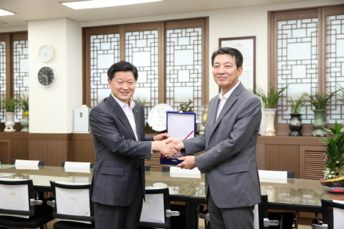 ▲최창식 중구청장(왼쪽)과 이신기 신한금융지주 부사장(오른쪽)이 19일 오전 중구청에서