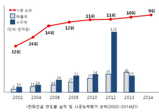 한화건설은 올해 시공능력평가에서 토목, 건축, 플랜트 부문에서 균형 잡힌 포트폴리오를 구축하고 있으며 80억불 규모의 이라크 신도시 건설공사가 본격화되고 있다는 점에서 높은 점수를 받은 것으로 평가되고 있다.
