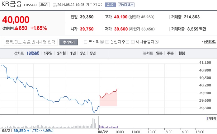 KB금융지주는 22일 오전 10시5분 현재 주가가 전일보다 700원(1.78%) 오른 4만50원에 거래되고 있다. 전날 금감원은 제재심의위원회를 열고 도쿄지점 불법대출 및 주 전산기 교체를 둘러싼 내부통제 책임을 물어 임영록 KB금융지주 회장과 이건호 국민은행장에 대해 모두 경징계 처분인 ‘주의적 경고’제재를 조치했다.