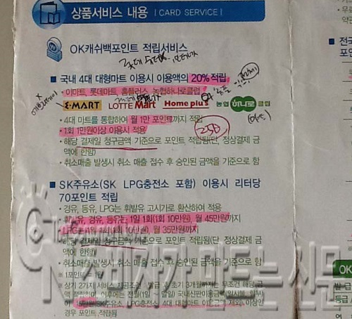 국내 4대 대형마트 이용 시 이용액의 20%(대형마트 사용 분 제외 전월실적 15만원 이상 시)를 1만원까지 OK캐쉬백 적립해주는 조건이어서 매달 전월실적까지 챙겨가며 충족 조건을 맞춰 포인트를 적립해왔던터라 당혹스럽기까지 했다.