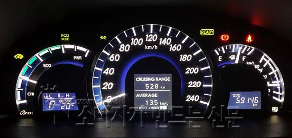 충전 여부는 계기판에서도 쉽게 확인할 수 있어 순간 연비를 체크함과 동시에 연비를 염두한 주행을 할 수 있다. 일반 차량에서는 RPM게이지가 위치한 계기판 왼쪽에 전기모터 충전 여부가 표시되고 속도게이지 오른편에는 순간 연비가 실시간으로 게이지에 표시된다.