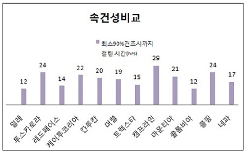 건조 속도가 가장 빠른 신발은 밀레와 컬럼비아 제품으로 12시간 걸렸다. 마르는 시간이 가장 긴 제품은 캠프라인 제품으로 29시간이 걸렸다.