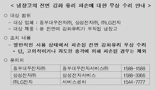 삼성전자, LG전자, 동부대우전자는 소비자원의 권고를 수용해 일반적인 사용 상태에서 냉장고의 전면 강화유리가 파손된 경우에 한해 무상 수리를 실시하기로 했다. 다만 고의적이거나 과도한 충격에 의한 경우는 해당되지 않는다.