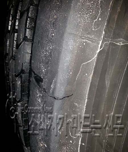 하지만 며칠 뒤 운행을 다녀오고 차량 점검을 하던 박 씨는 얼마 전 교체한 앞바퀴 측면과 바닥면이 갈라져 있는 것을 발견했다. 주행 당시 큰 충격도 없었고 교체한 지 얼마 지나지 않아 의심스러운 점 투성이었다.