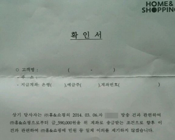 큰 돈을 날리게 생긴 하 씨는 구입처인 홈앤쇼핑에 연락을 했지만 뾰족한 해결책이 없었다. 여러차례 항의한 끝에 118만 원 중 절반인 59만 원을 보상해주겠다는 답변을 들을 수 있었으나 ‘환불 후 더 이상 민원을 제기하지 않겠다’고 약속하라며 확인서를 보내왔다.