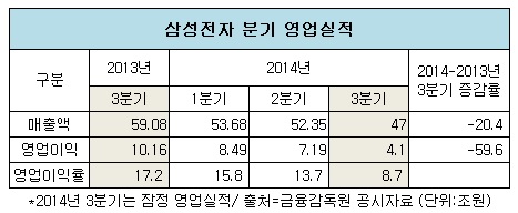삼성전자(대표 권오현·윤부근·신종균)가 지난 3분기 영업이익이 4조 원대에 그치는 등 어닝 쇼크를 기록했다.