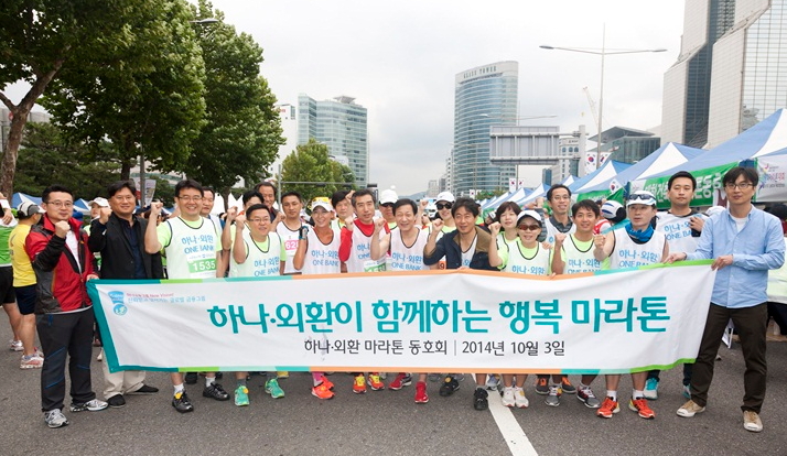 하나-외환은행은 올 상반기부터 임직원들이 공동으로 참여하는 봉사활동을 전개하고 있다. 지난 3일 하나-외환은행의 마라톤 동호회원들은 제12회 국제평화마라톤 대회에 출전했다. 통합을 앞둔 두 은행 마라톤 동호회원 49명이 공식적으로 첫 만남의 자리를 갖게 된 점과 ‘함께’ 달린다는데 의미가 크다는 평가다. 이날 참석한 동호회원들은 '하나외환 ONE BANK'라고 쓰인 유니폼을 입고 대회에 참가했고 완주를 통해 성취의 기쁨을 나눴다는 후문이다.