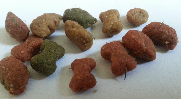 이미 3분의 1 가량 먹인 사료 알맹이에 동물의 털로 보이는 이물이 박혀 있었던 것. 혹시나 해서 나머지 사료들을 부어보니 3~40개 정도의 알맹이에서 흰색과 검은색 털들이 박혀 있는 걸 확인할 수 있었다.
