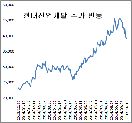 현대산업개발 주가는 지난해 말 2만3천200원에서 올해 2월 3만 원을 넘고 9월 중순 4만5천 원대를 돌파하는 등 올들어 가파른 오름세를 보였다. 최근 주가가 4만 원 밑으로 다시 떨어지기는 했지만 올들어 상승폭이 60%에 육박한다. 이에 힘입어 시가총액도 지난해말 1조7천억 원에서 최근 2조8천억 원으로 증가했다.