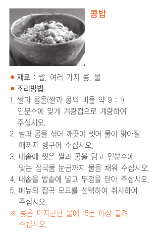 제품설명서상에 설명한 레시피 범주에서 과도하게 벗어날 경우 정상적인 조리가 불가능한 것은 물론 기기 고장 확률이 높아지기 때문이다.