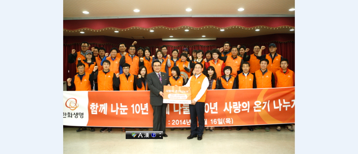 한화생명은 한화그룹 창립 62주년을 맞아 10월 한달간 소외이웃을 돕기 위한 봉사활동을 릴레이로 펼쳐나갈 계획이다. 본사에서는 15일 점심시간에 63빌딩 로비에서 클래식 음악회를 열었다. 또한 40여명의 임직원·FP가 활동하는 ‘한화생명 콕콕합창단’도 공연을 펼쳤고, 임직원들이 공연 관람 후 자발적으로 모은 기부금 500여만원은 백혈병소아암 돕기 성금으로 전달할 예정이다.
