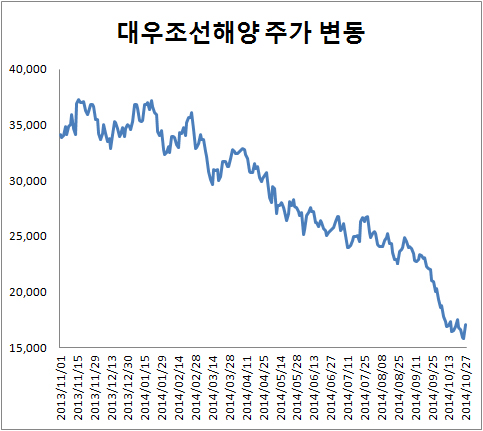 하지만 주가는 올해 초와 비교해 반토막 수준으로 떨어지는 등 맥을 못 추고 있다. 대우조선해양은 올해 1월 3만7천 원까지 올랐던 주가가 10개월 만에 1만5천 원 수준으로 57.4% 떨어졌다.